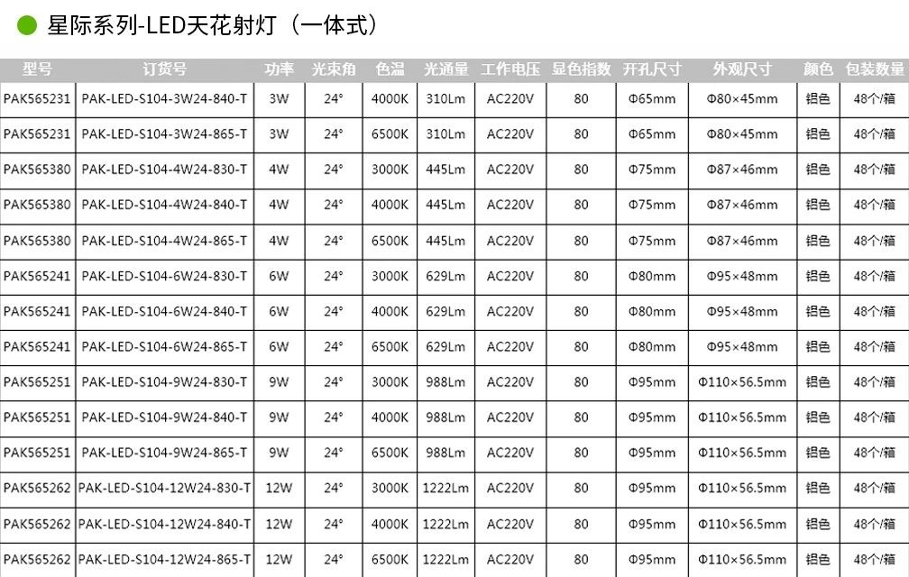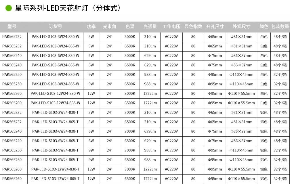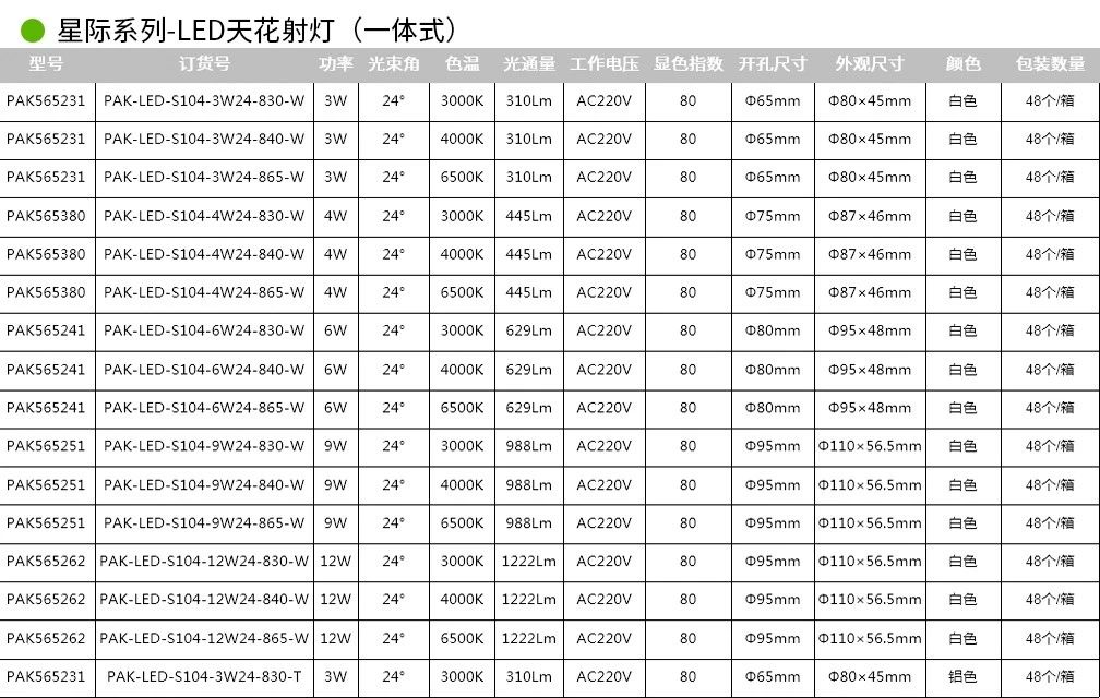 产品型号:PAK565231 产品描述:LED天花射灯 星际 3W 3000K 24度 一体塑环 白色
