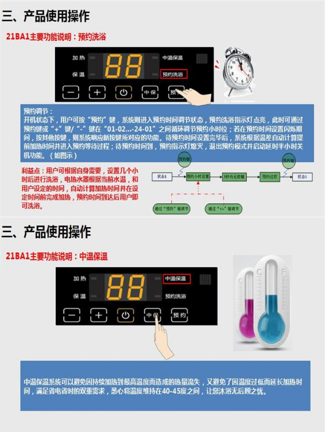 ◇采用防干烧、防超温、防漏电、防高水压等多重保护装置以及IP×4级防水设计,安全有保障;
