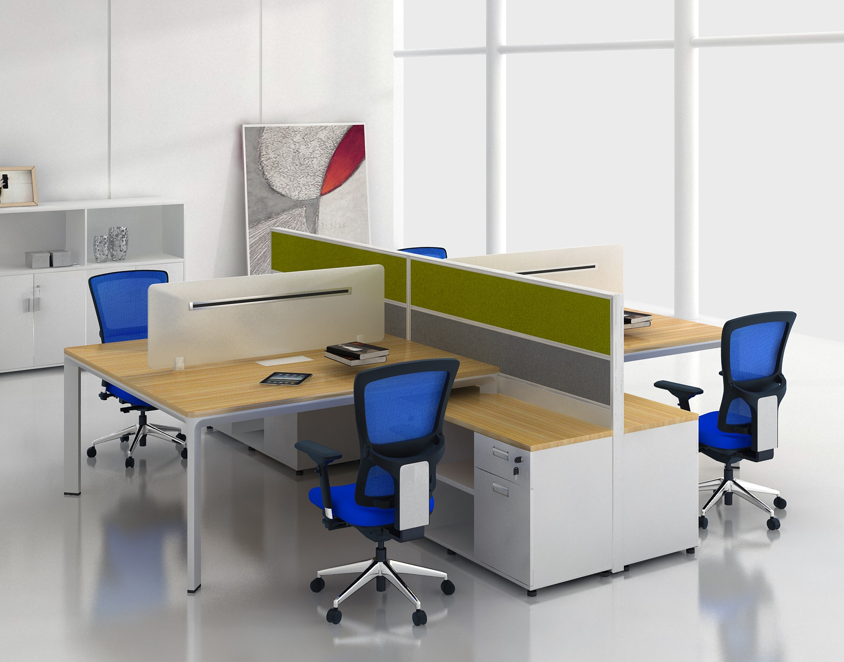 (5)钢脚架采用静电粉沫喷涂,经高温炉固化局融,产品抗蚀耐磨能力强。备注:配18MM桌屏MFC板配挂槽,中间莫特斯40#布绒饰面屏风,台面板配毛刷线盒,含副柜。