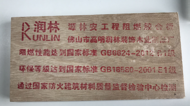 由原木旋切成木片或由木方刨切成小木方块,对木片进行阻燃处理后再用胶粘剂胶合而成的三层或多层的胶合板
