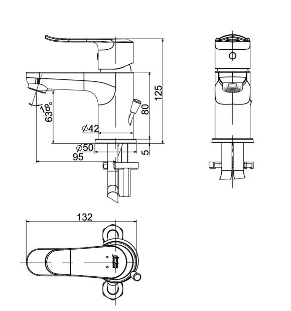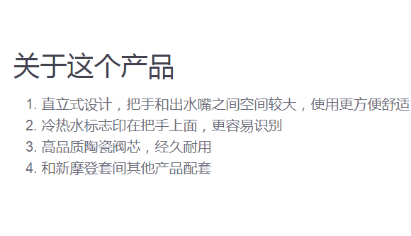 立式设计,把手和出水嘴之间空间较大, 冷热水标志印在把手上面,更容易识别 高品质陶瓷阀芯,经久耐用