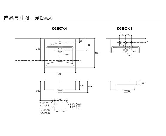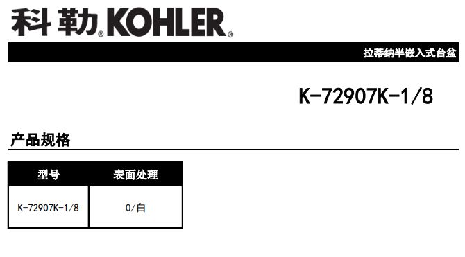 科勒洁具 K-72907K-1-0 LADENA拉蒂纳 半嵌入式台盆