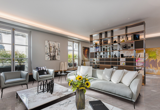 在有意与无意间将内敛与轻巧演绎得淋漓尽致。间或期间的亮色细线,似岁月的流光剪影,将大理石的久远与独特留在岁月里