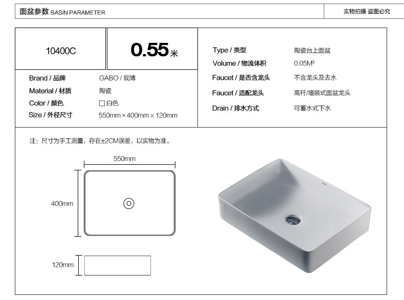 观博卫浴 方形台上盆陶瓷艺术盆10400C-BY 陶瓷洗脸盆陶瓷面盆洗手盆